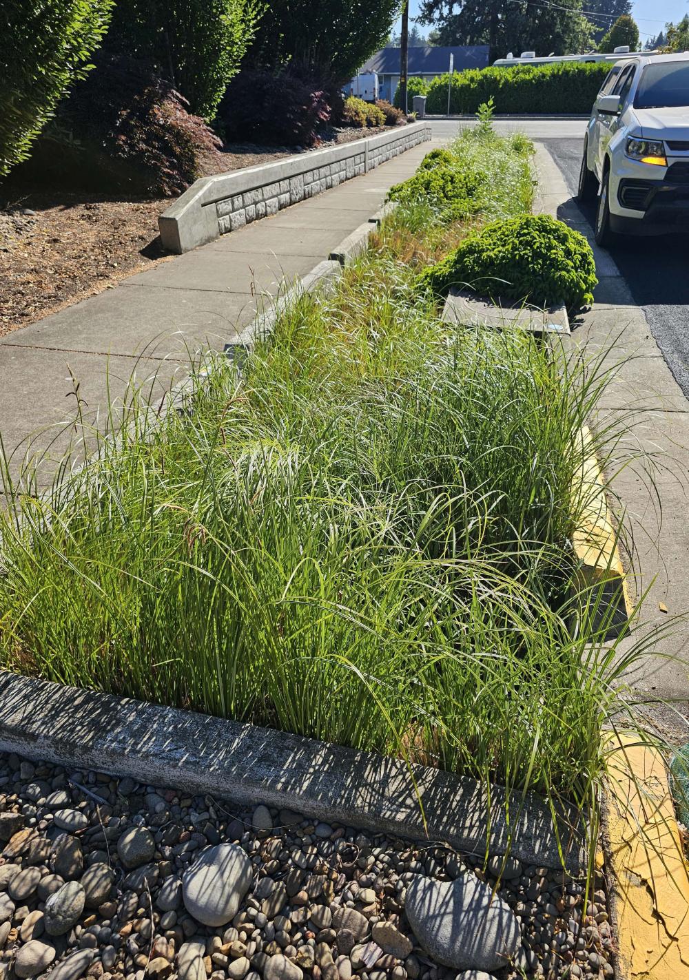 A new element of this project is stormwater management planters. These facilities contain plants and soil that help filter and treat stormwater runoff from the street to reduce pollution in our environment. Please see the conceptual graphic and picture below of a local facility.