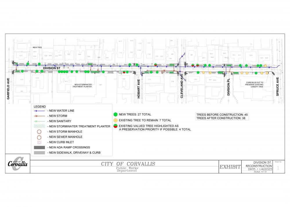 One consequence of this work is that many of the existing street trees along Division will need to be removed.  Unfortunately, over time, some of the trees have damaged the waterline, sidewalks or impaired street drainage.  We have worked hard to save as many as possible and replace them at a near one-to-one ratio in locations, and with species, that will provide long lasting benefit without future damage to our streets and utilities.  Please see the graphic below showing locations for all the new facilities being constructed and where new trees will be planted. If you would like to learn more about why a specific tree must be removed, please email UrbanForestry@corvallisoregon.gov.